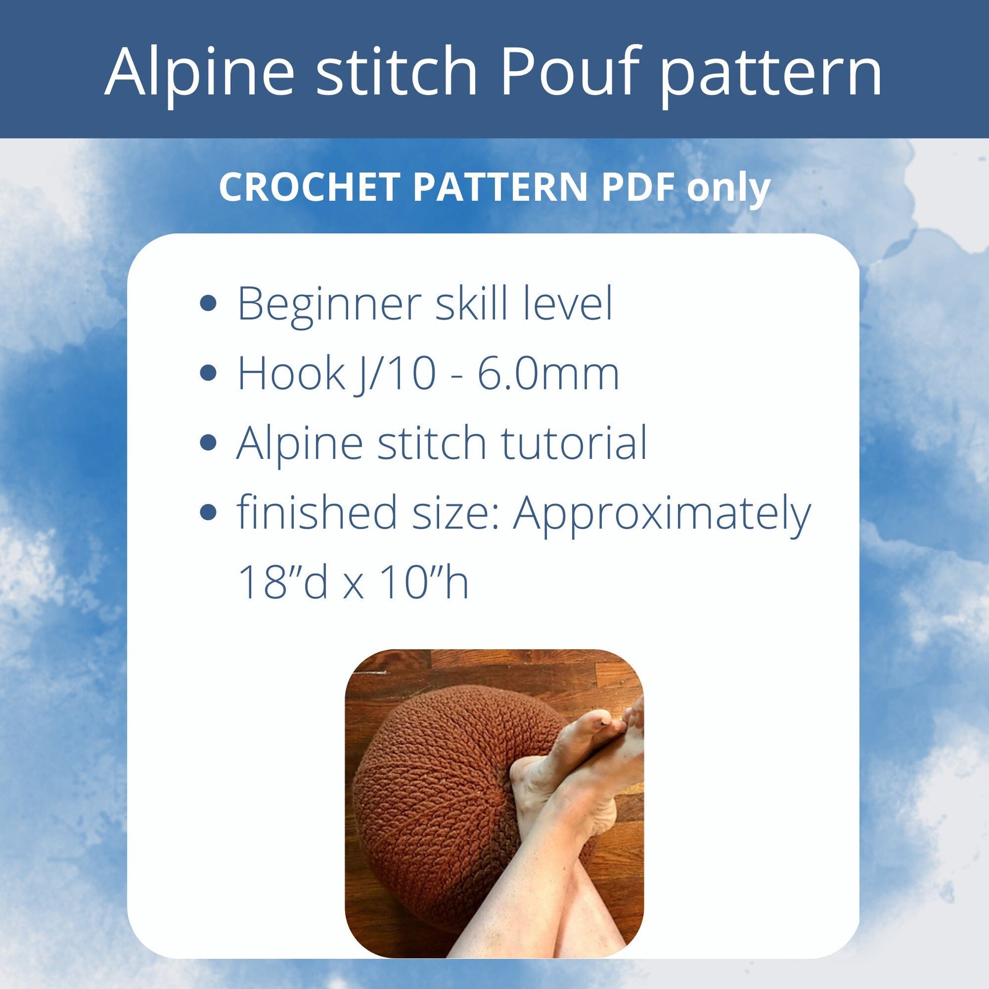 The pattern features the alpine stitch, worked in the round, to create a beautifully textured surface. With detailed pictures and helpful video tutorials included in the PDF crochet pattern, even those new to crochet can successfully create a stunning pouf.