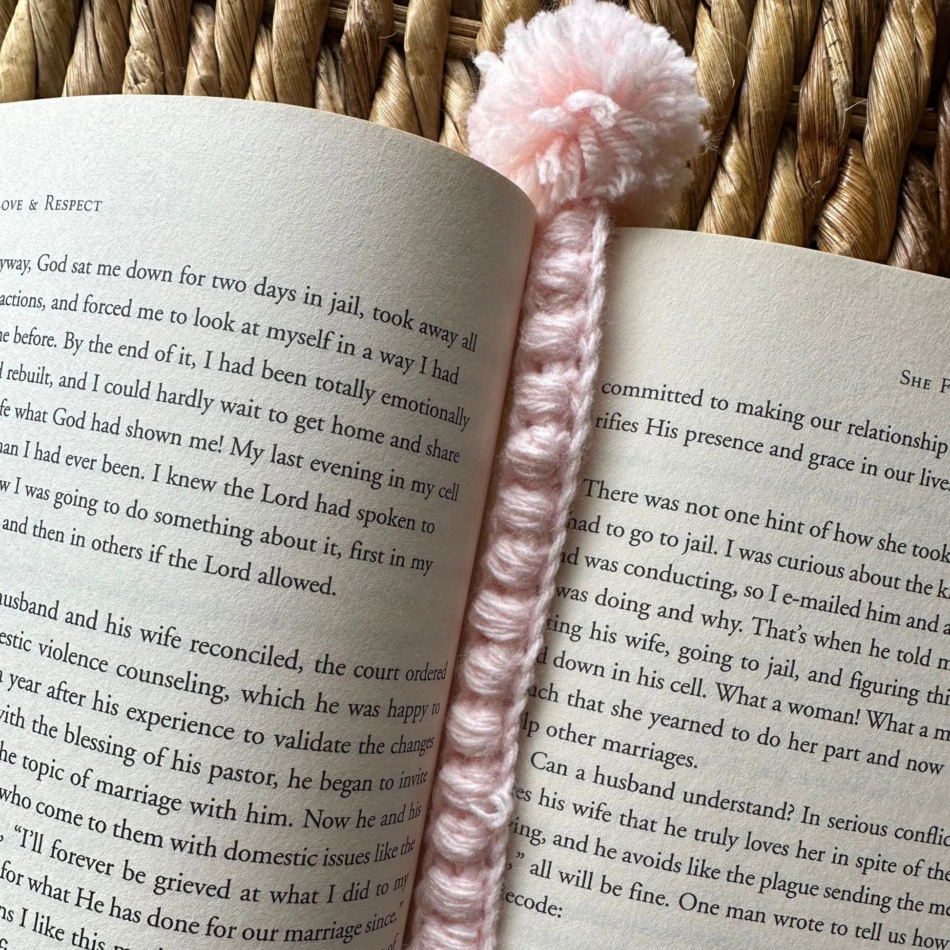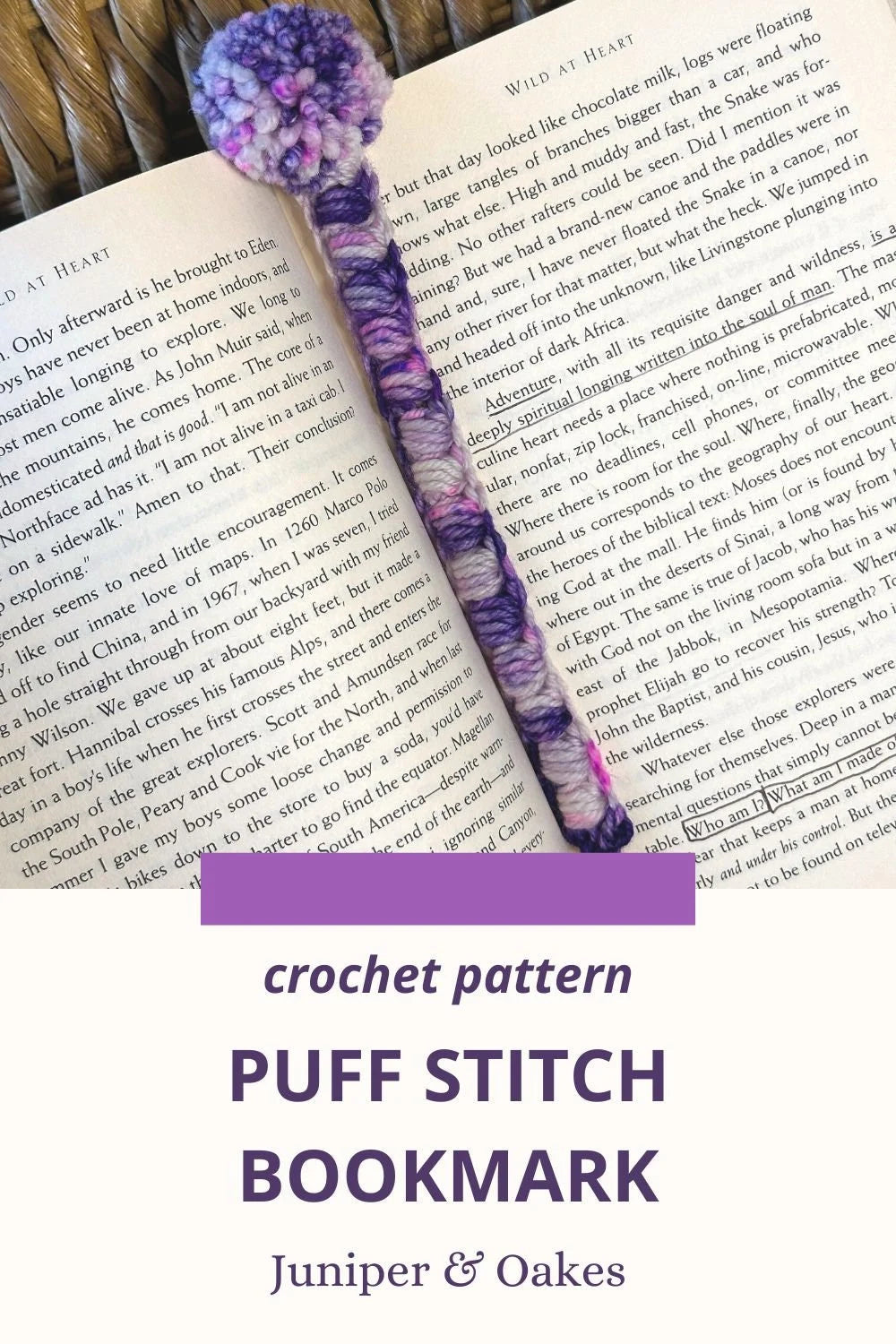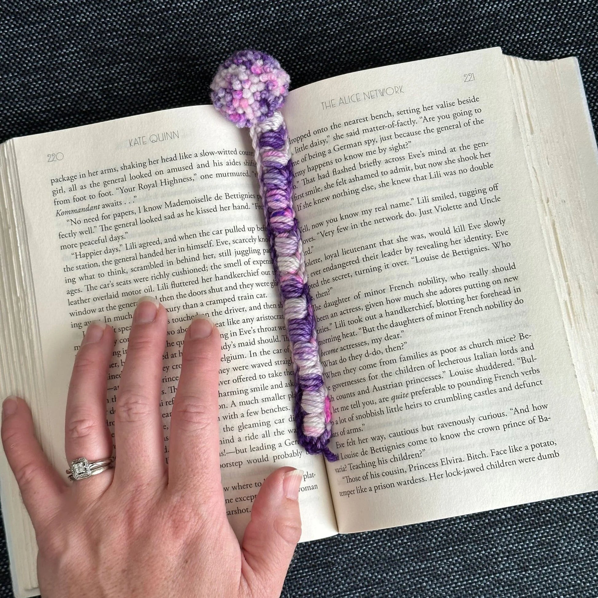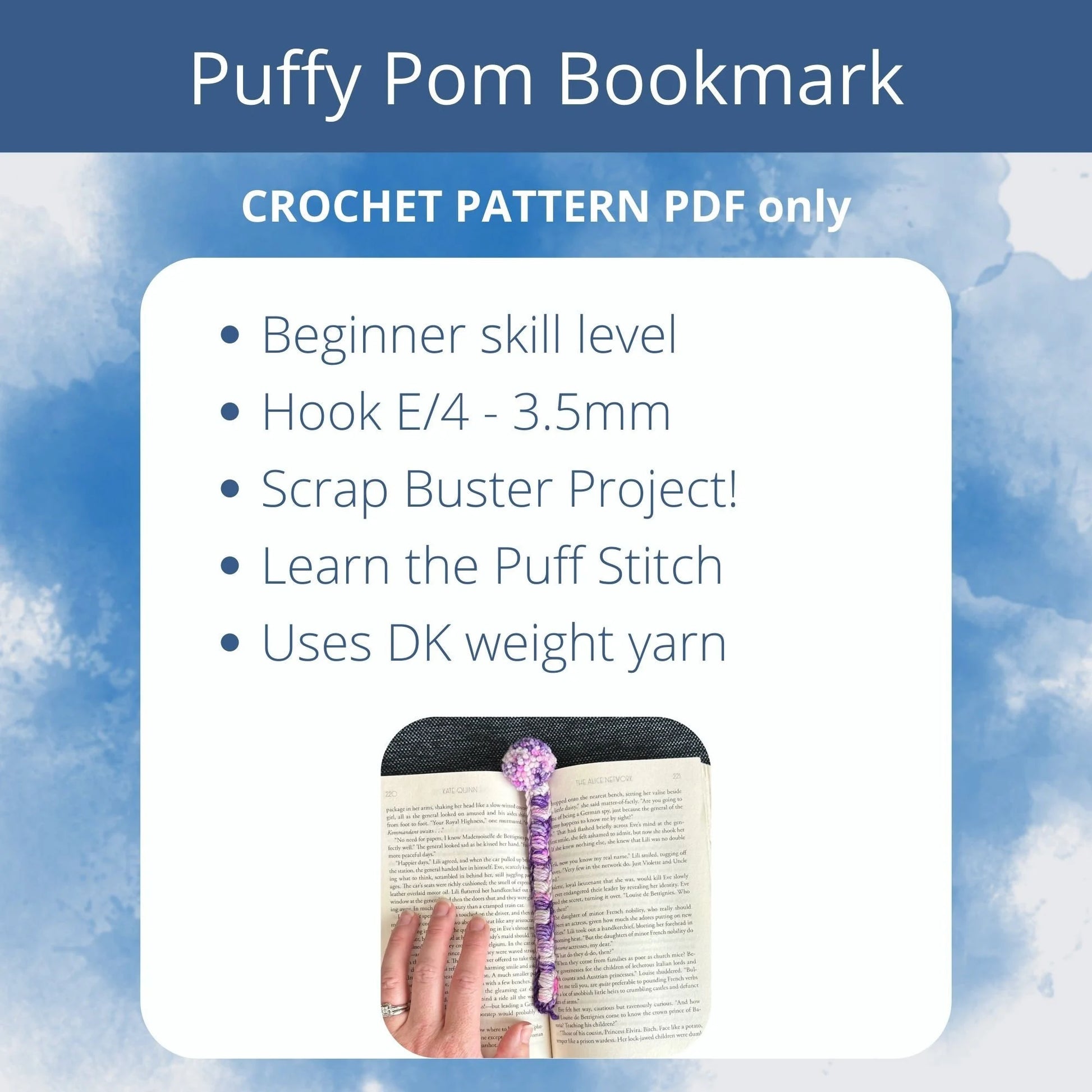 Fun Pom Pom Bookmark Crochet Pattern PDF. Using the crochet puff stitch. Easy Scrap Yarn Project for Book Lovers
