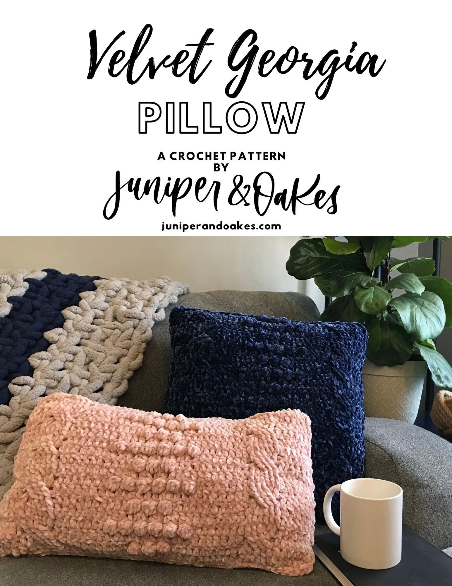 Made using Bernat Velvet Yarn (or any other bulky/chunky yarn). Featuring crocheted cables & bobbles. This pattern walks you through how to crochet the Velvet Georgia Pillow in two different sizes with two different finishes. There are written instructions, pictures, and videos to help you along.