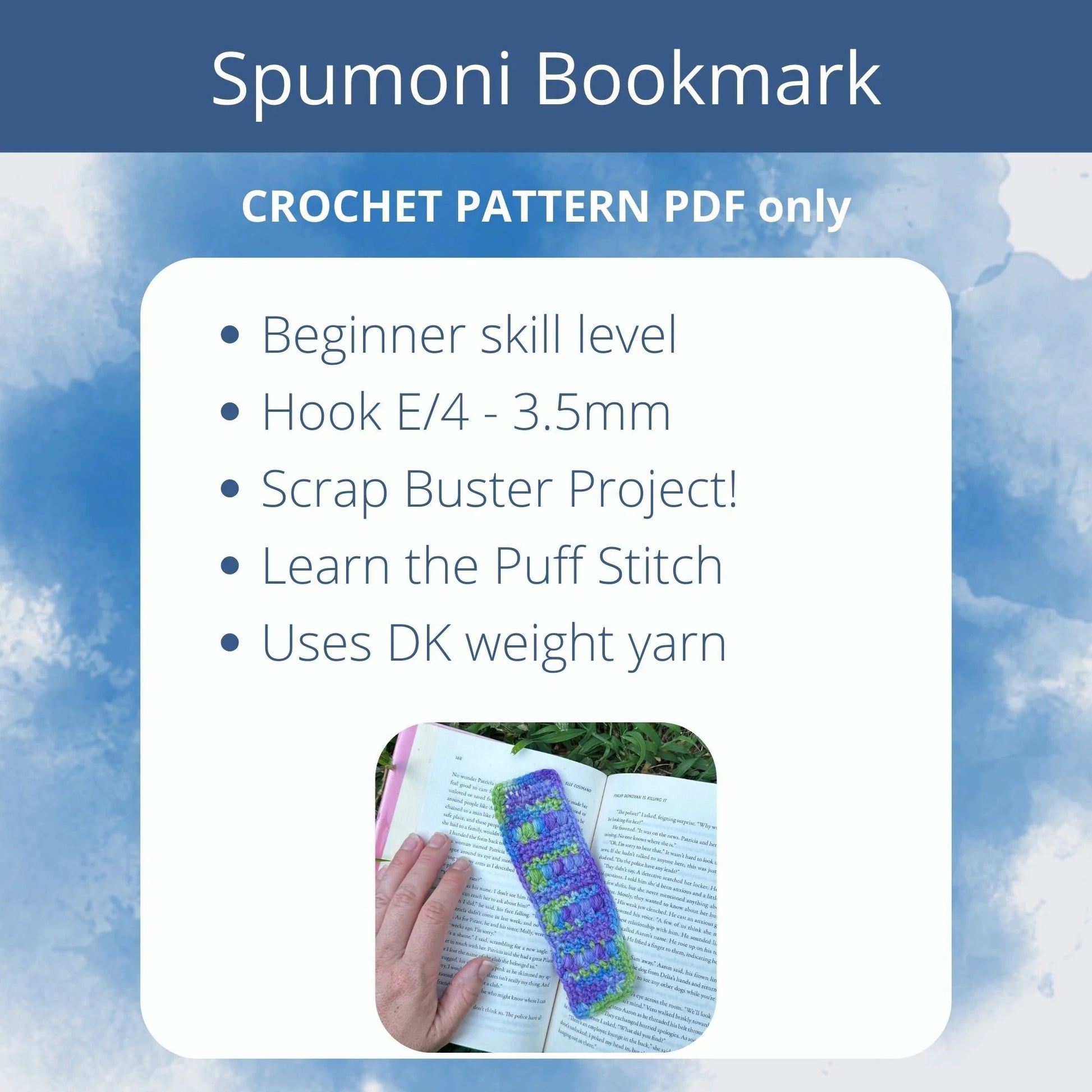 This Spumoni Bookmark Crochet pattern uses a the puff stitch & mesh stitch to create a simple yet unique bookmark that can be used again and again.