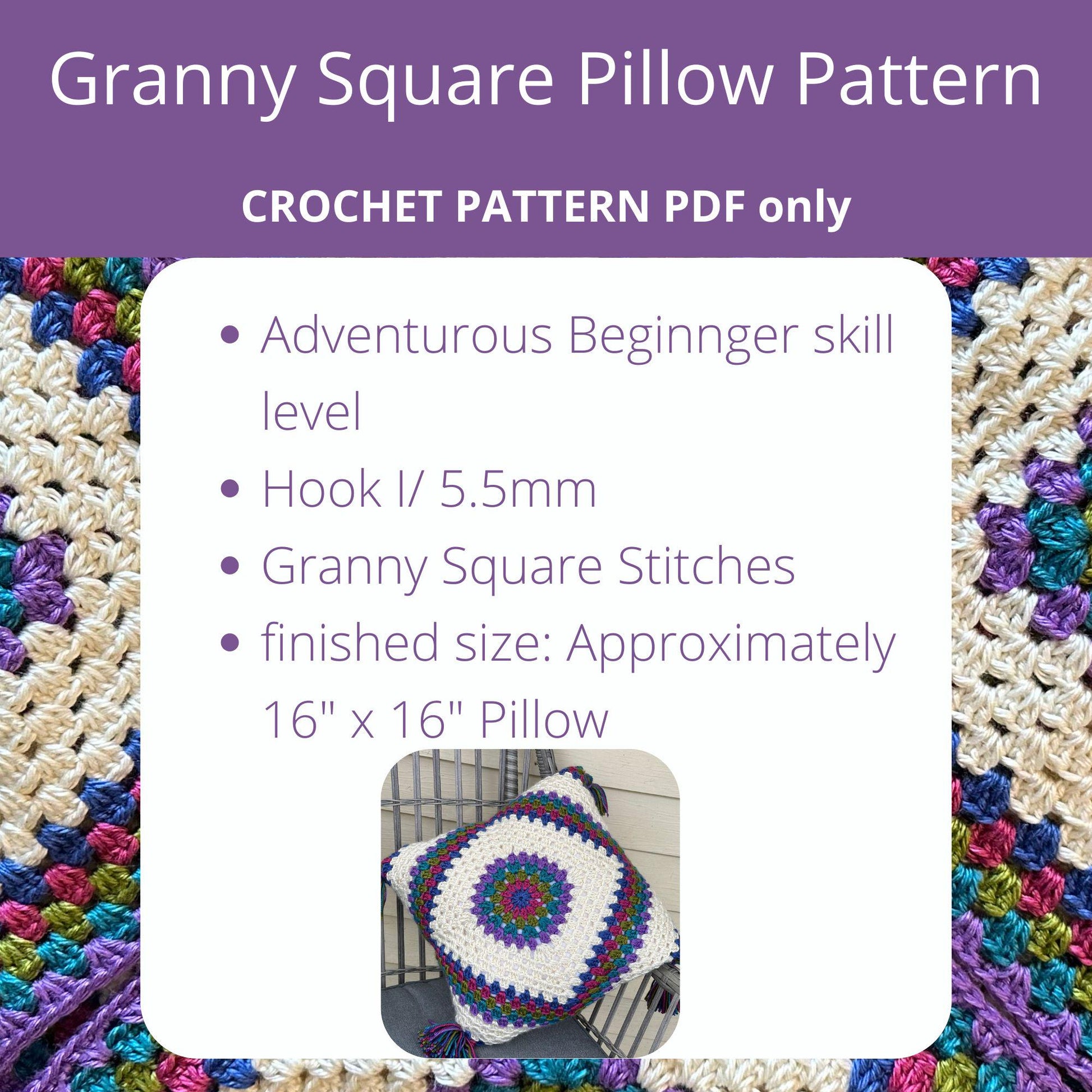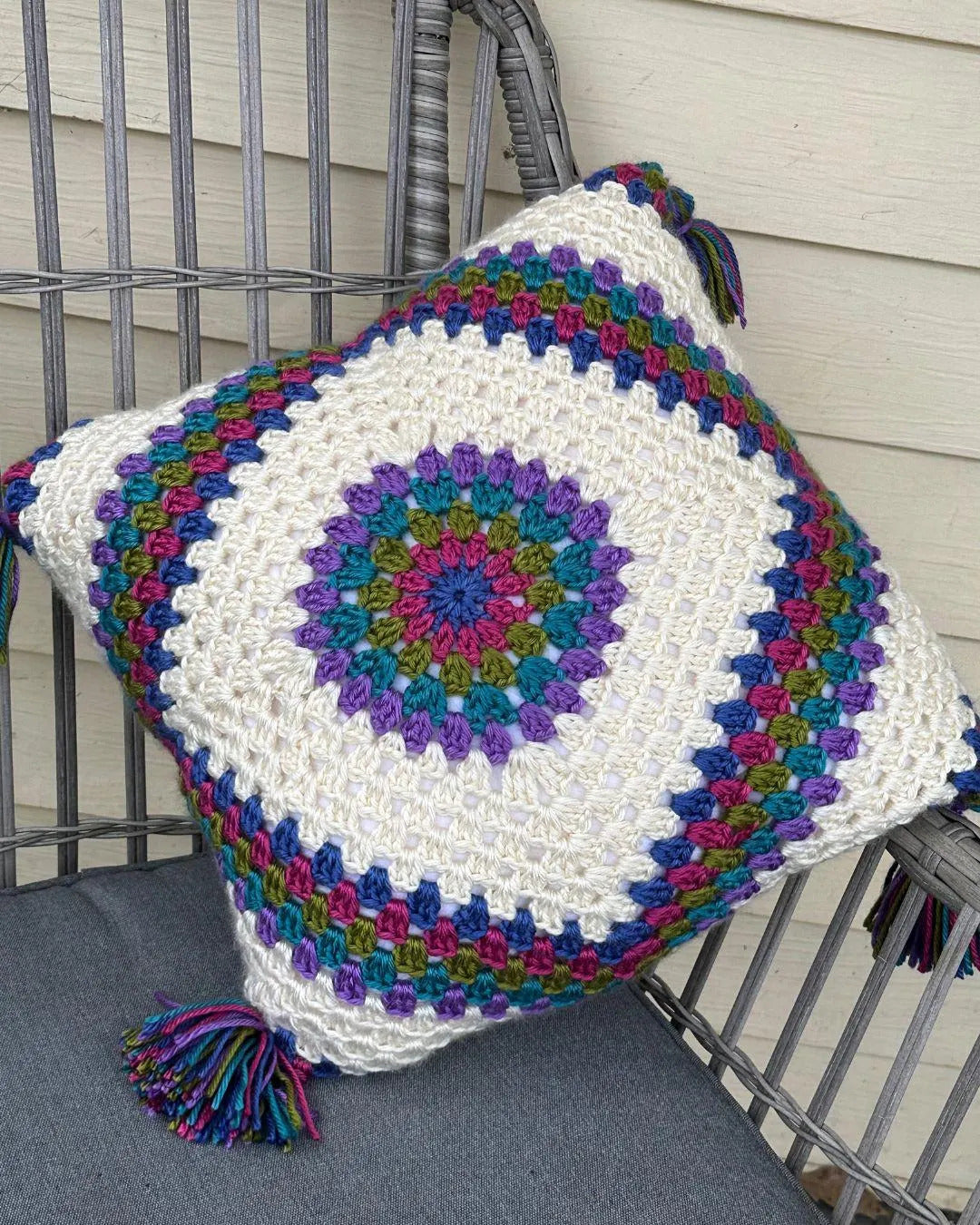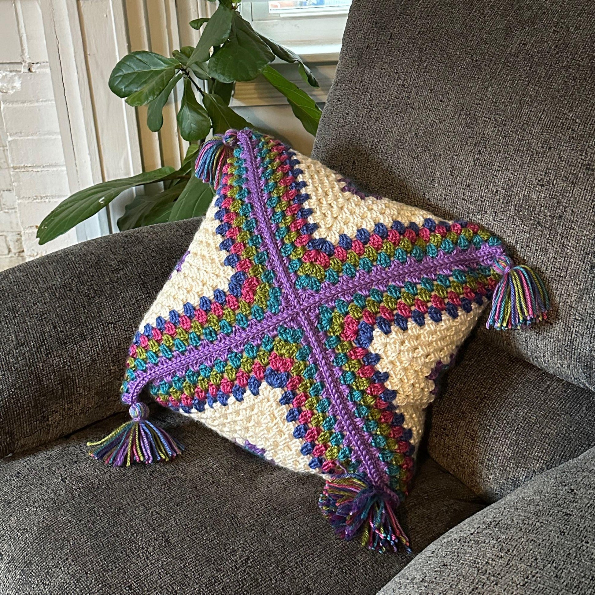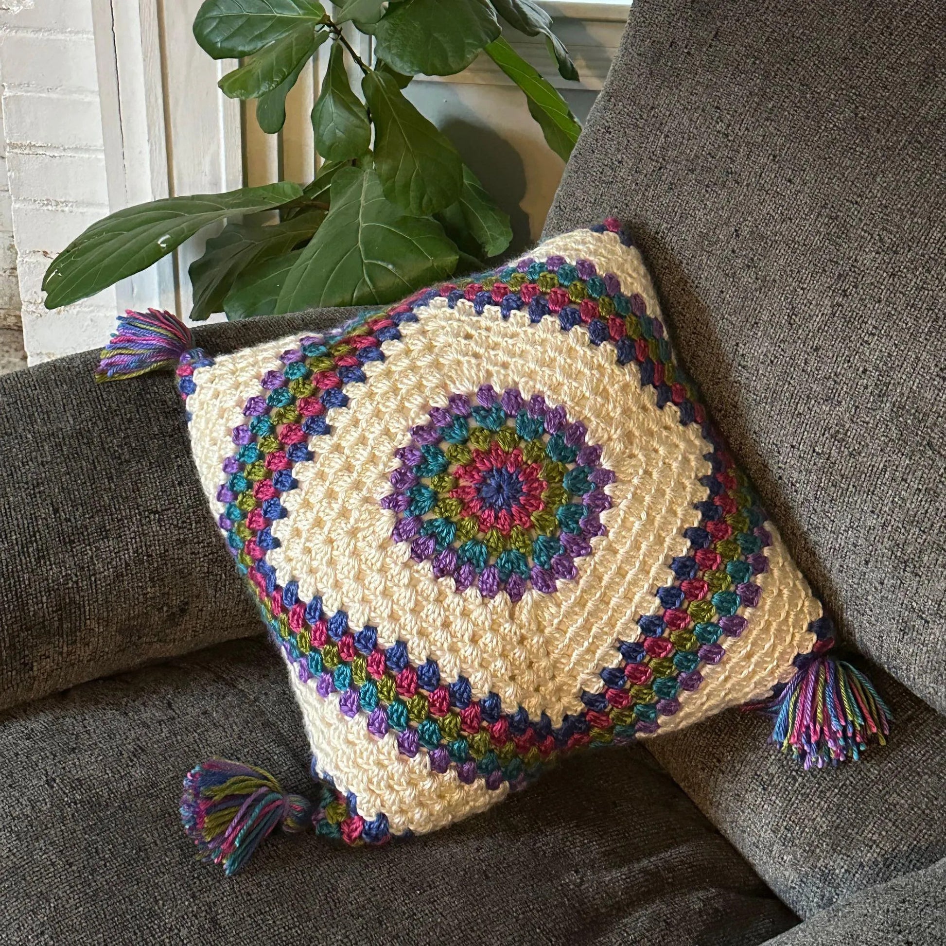 Rainbow Granny Square Pillow Crochet Pattern with tassels- Boho Crochet pattern - worsted weight yarn.