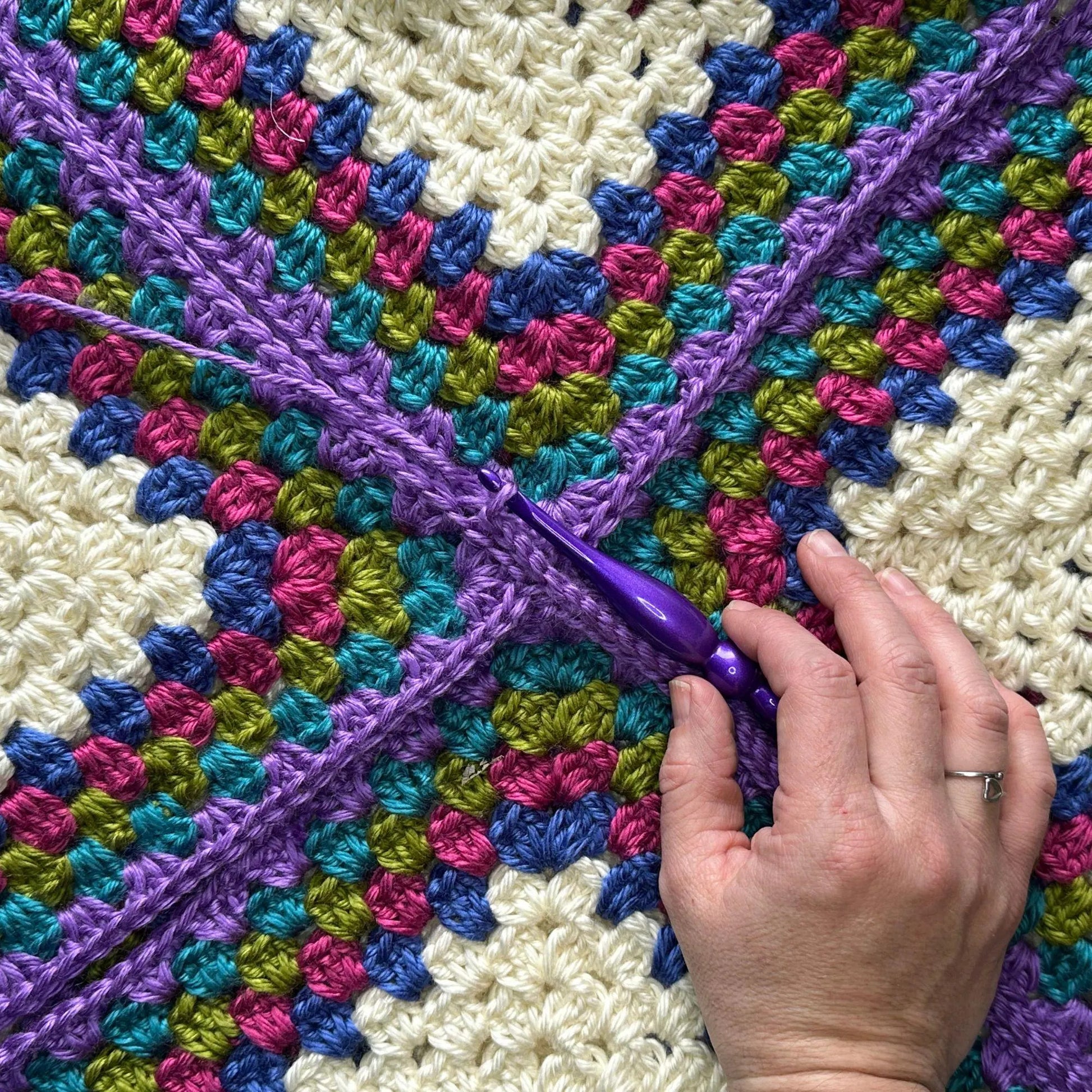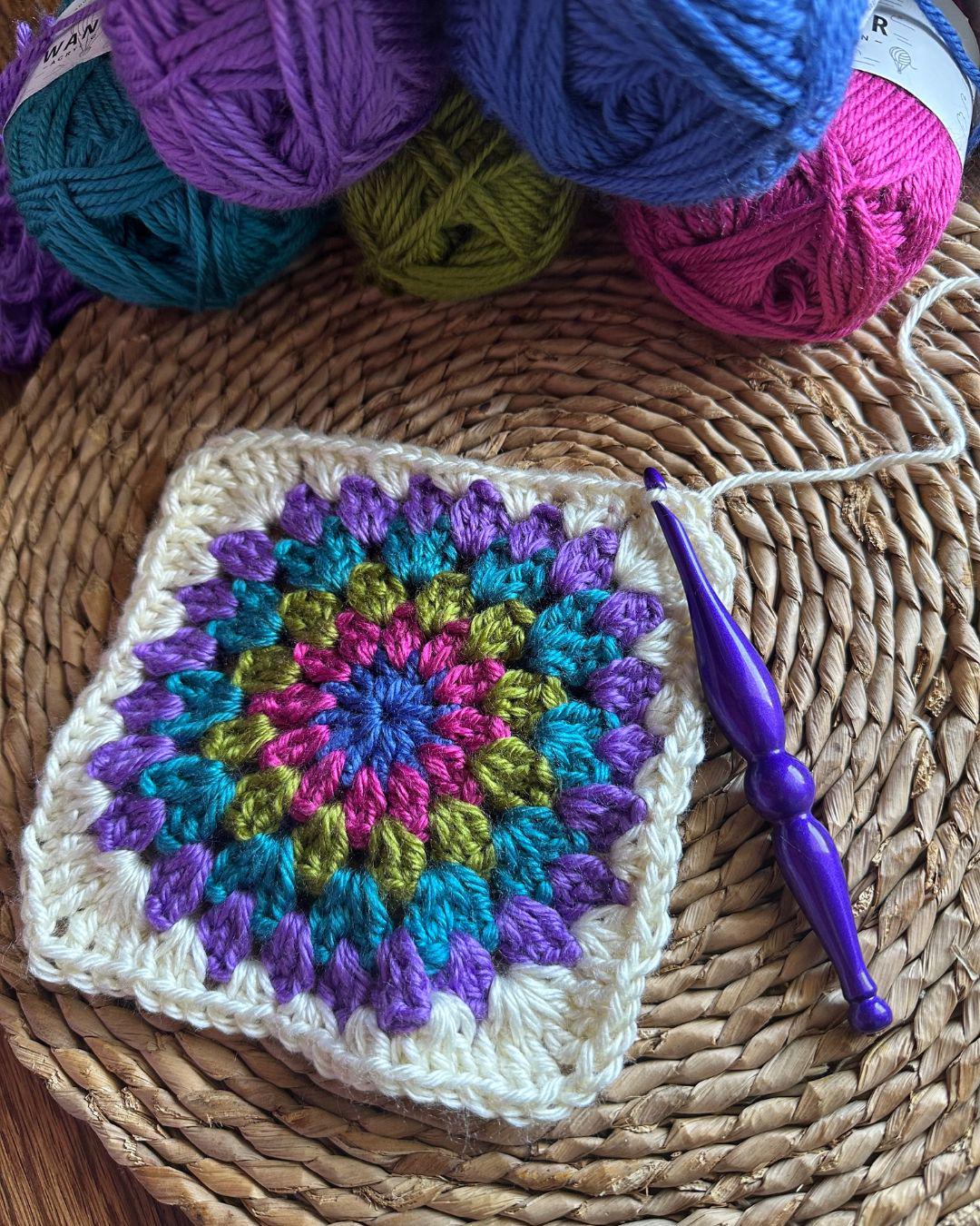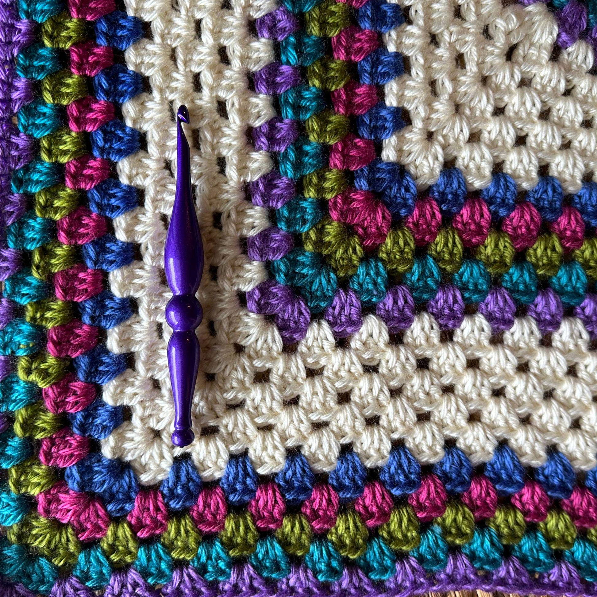 Combination of granny squares, stripes, and tassels for a bohemian-inspired design
